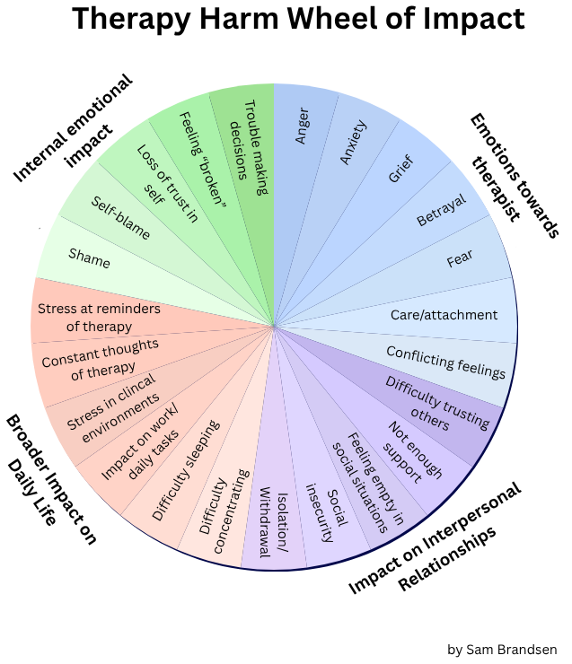 The goal of this article is to create a set of items that often occur in therapy harm, using an expanded definition of harm — i.e. any situation that led to confusion, distress, or a negative impact for the patient (with therapy abuse or unethical behaviour then becoming a specific subset of therapy harm)— as well as accompanying visual diagrams. While many items on the list are always unethical, such as a clinician dating a patient, a few items might be okay or even beneficial in specific circumstances, but are included because they have a high risk of leading to harm or confusion in the patient. Still other items may be due to factors outside of a clinician’s control (for example, cases where a clinician sadly passes away unexpectedly), but nonetheless may end up being deeply distressing for the patient.